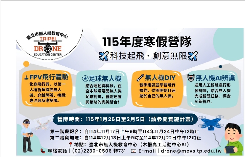 (六)檢附「臺北市無人機教育中心115年度寒假營隊實施計 畫」1份,倘有任何疑義,請逕洽臺北市無人機教育中心 蔡麟傑執行秘書,聯絡電話:(02)22300506轉731,電 子信箱:drone@mcvs.tp.edu.tw。