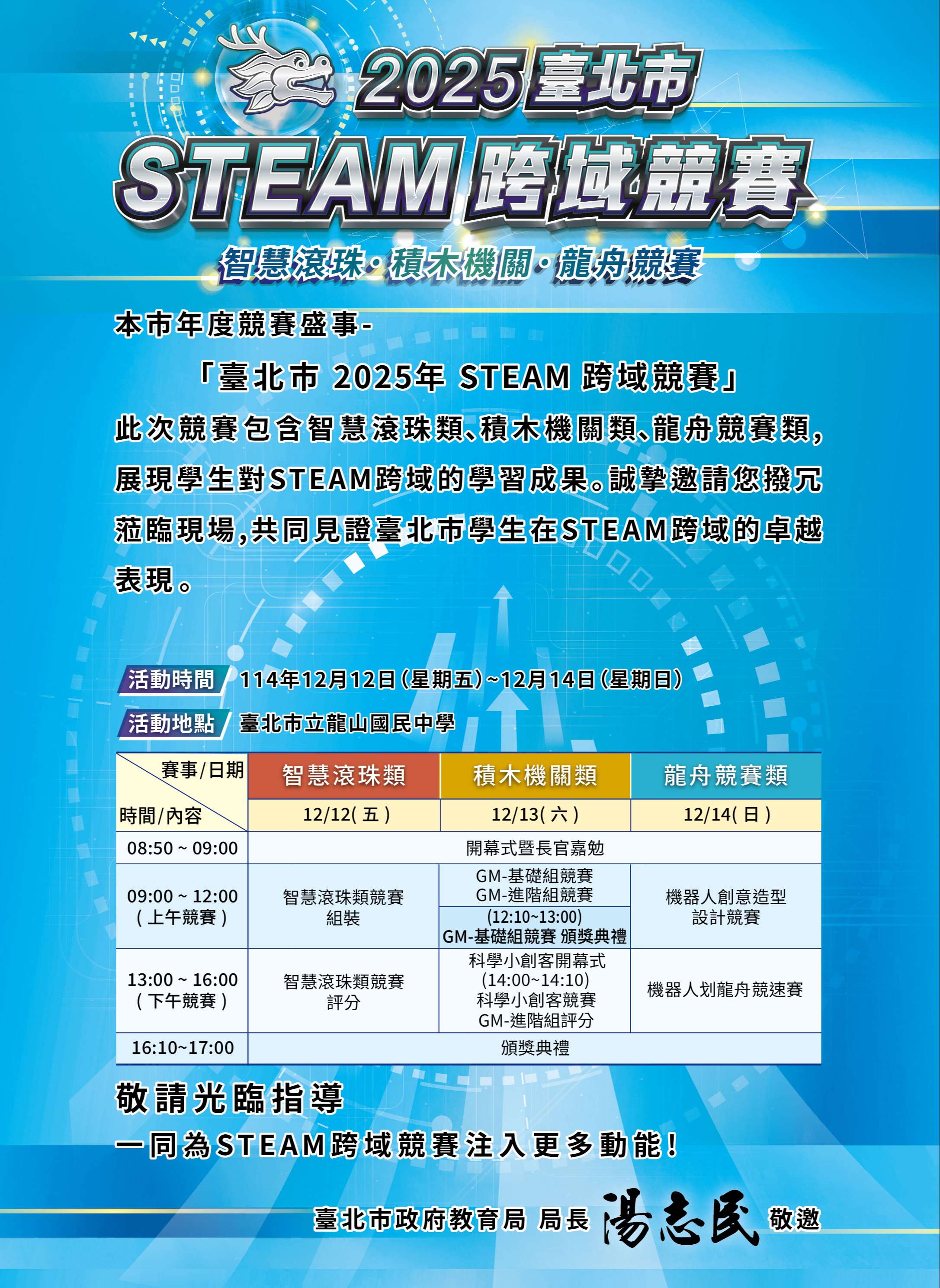 114年12月12日(星期五)至12月14日(星期日)辦理 「臺北市2025年STEAM跨域競賽」暨頒獎典禮。
