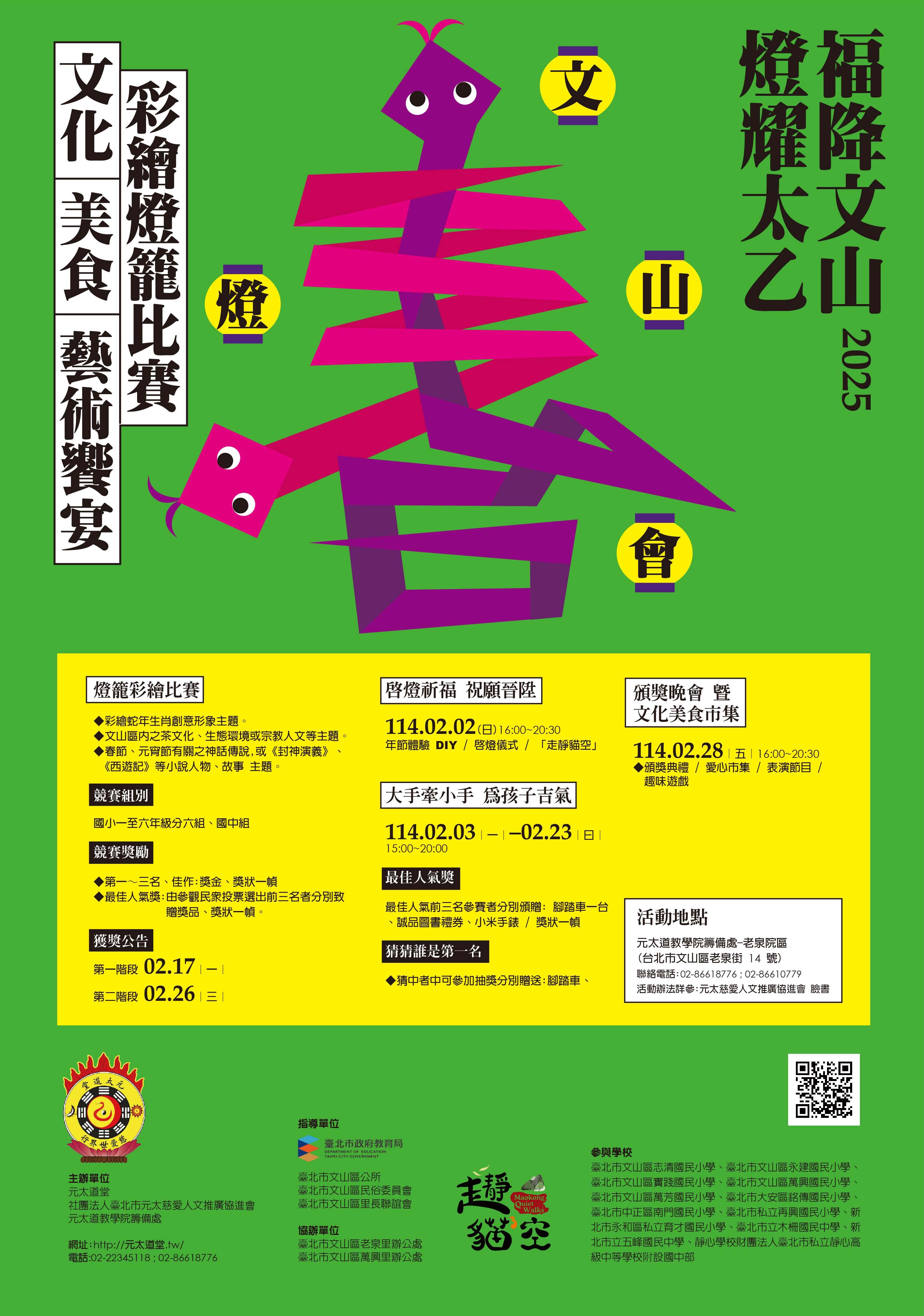 (一)點燈儀式:114年2月2日下午4時至6時,屆時將安排傳統元宵燈節搓元宵、持火把、走靜貓空等活動。