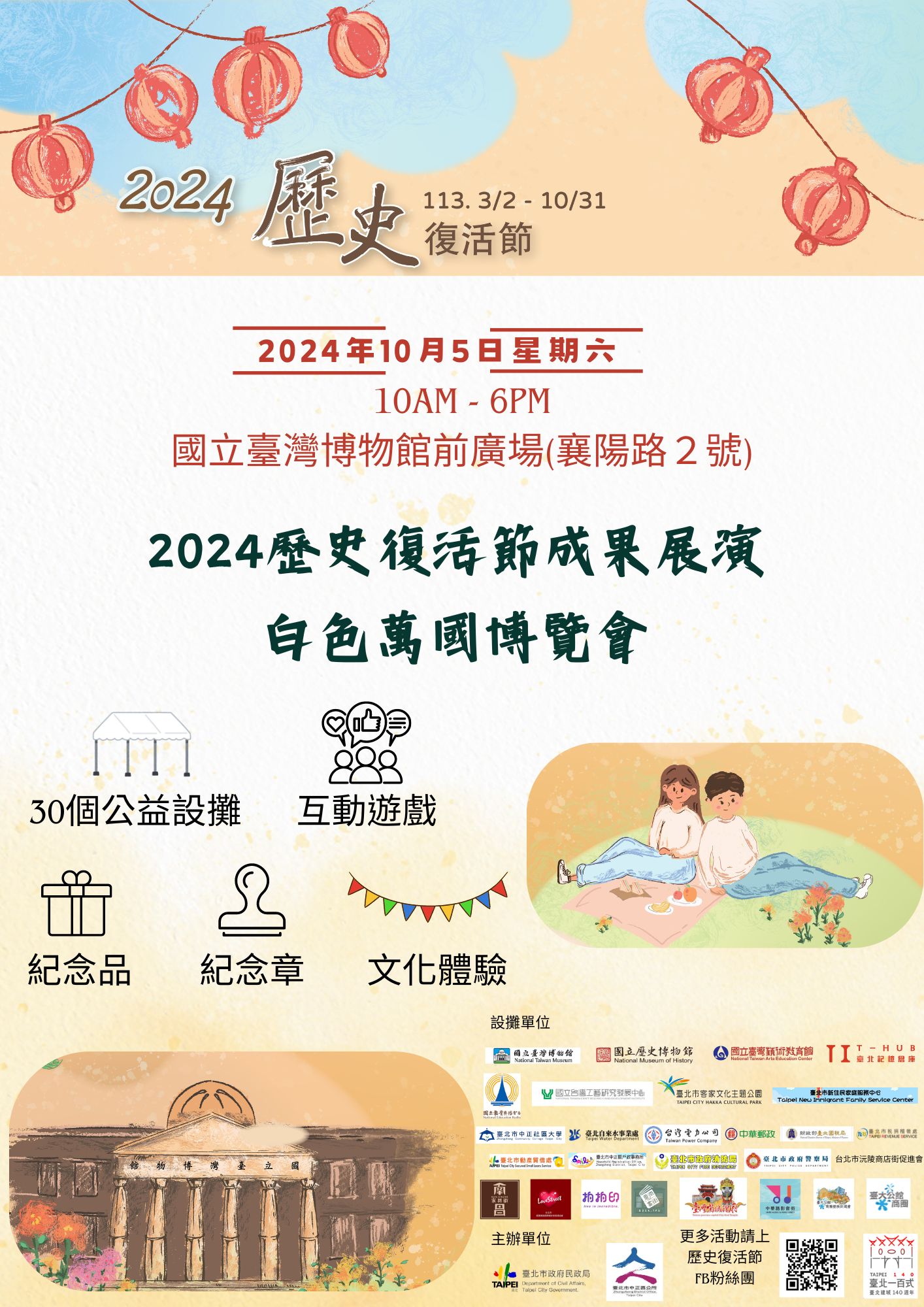 臺北市中正區公所將在113年10月5日(星期六)上午10時至下午6時於二二八和平公園-國立臺灣博物館本館(襄陽路2號)前廣場,舉辦 「2024歷史復活節- 白色萬國博覽會」,展演歷史復活節活動成果,特邀區 內各機關、博物館、古蹟場館等一起設置30個公益攤位,邀請您一同品文化、玩體驗、拾回憶,感受獨特的 中正區地方特色!更多活動詳情請上歷史復活節FB粉絲團(https://www.facebook.com/papagozhongzheng),或上臺北市中正區公所網站基層藝文專區(https://zzdo.gov.taipei/基層藝文)查詢。