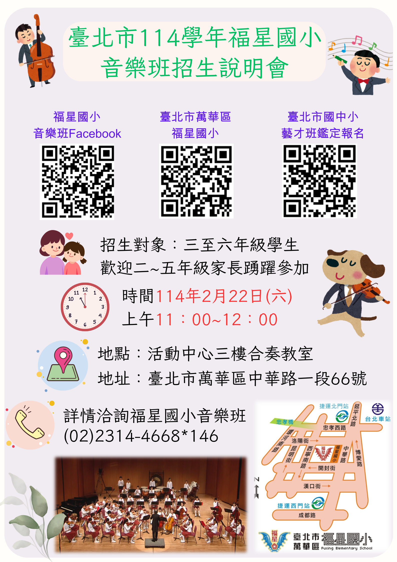 一、福星國小今年承辦臺北市114學年度國民小學藝術才能音樂班招生。