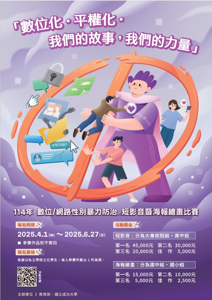 二、本活動之主題、參加資格、報名及送件方式如下: (一)活動主題:得參考行政院函頒「數位/網路性別暴力之定義、類型及其內涵說明」(網址:https://reurl.cc/13D1MQ),創作10種數位/網路性別暴力態樣之短影音 (大專校院組及高中職組)及海報繪畫(國中組及國小組)作品。(二)參加資格:應屆畢業生者以114年8月之在學學制為參加 組別(例如:現就讀國小六年級之學生欲參加海報繪畫 比賽,則需勾選國中組),每人參賽件數以1件為限。 (三)報名及送件方式: 1、甄選作品類別:短影音(大專校院組及高中職組)、 海報繪畫(國中組及國小組)。 2、報名及送件資料:應包含比賽報名表、切結書、個人 資料使用授權同意書、著作權授權同意書及實體作 品。 3、收件時間:自114年4月1日(星期二)起至114年6月27 日(星期五)止,以郵戳為憑。 4、收件地址:以掛號郵寄至「702臺南鹽埕郵局第21號信 箱」,並請於信封袋上註明「教育部114年數位/網路 性別暴力防治—短影音暨海報繪畫比賽-魏小姐收」 之字樣。 四、本活動相關事宜,可參考教育部活動官網 (https://deosop2025.webnode.page),或洽詢劉小姐, 電話:06-2631841(聯絡時間為周一至周五,下午1時30分 至晚上8時)。