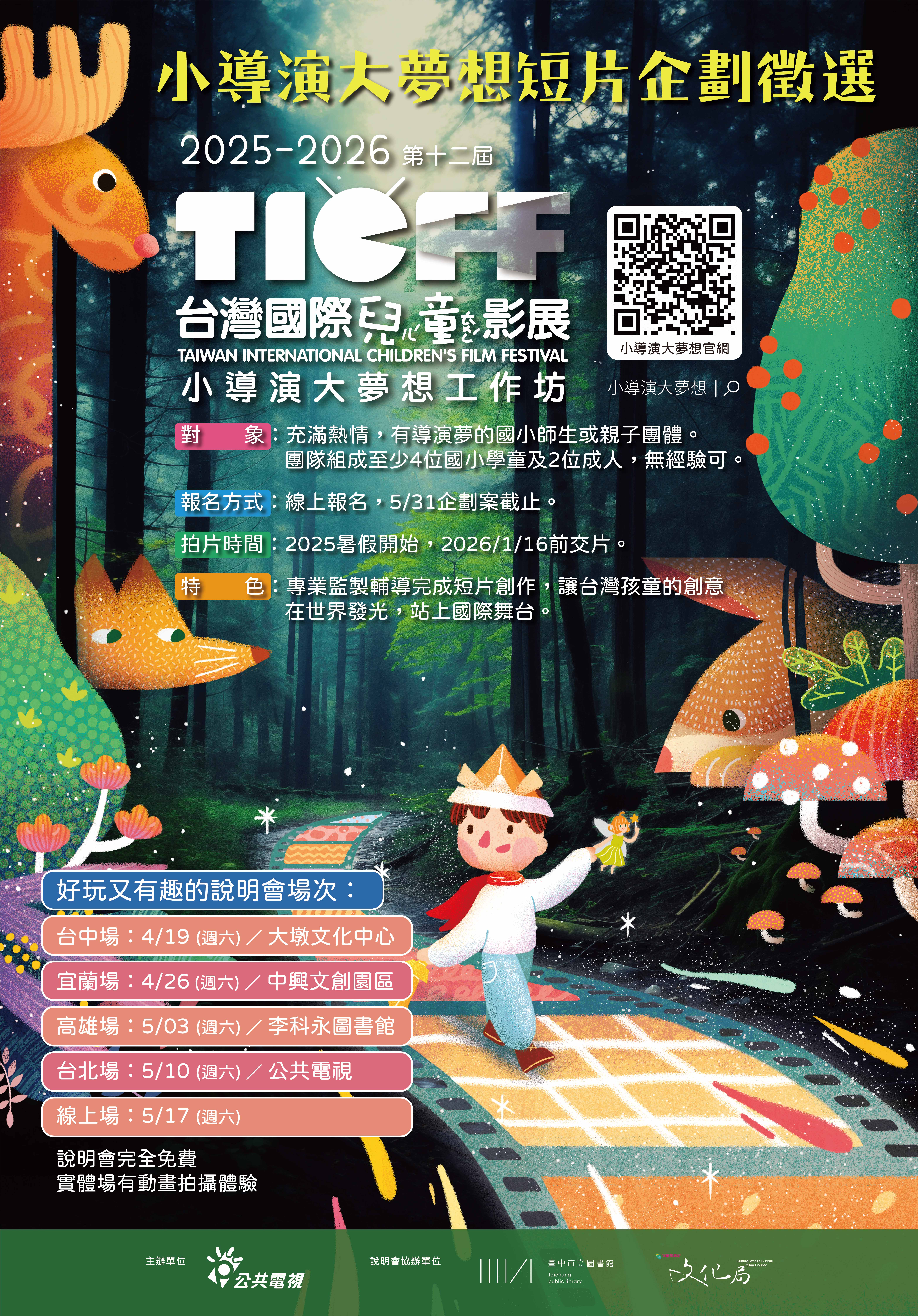 二、公視2025「小導演大夢想工作坊」即將開跑,本會將舉辦 「短片創作說明會」說明參加辦法及相關活動內容。說明會場次為2025/4/19台中大墩文化中心、4/26宜蘭中興文創 園區、5/3高雄李科永圖書館、5/10台北公共電視、5/17線上場。邀請專業影像工作者教授拍片企劃案撰寫、及小導演團隊分享拍片趣事,歡迎踴躍參加。說明會活動全程免費,請於活動官網線上報名。 三、「兒童短片企劃案徵選」於2025/5/31截止收件,歡迎國小師生、親子團隊組隊上網報名。提出拍片企劃參加徵選,入選團隊可享整套拍片輔導資源,完成短片擇優送國際參展。相關活動細節請上活動官網 https://www.pts.org.tw /dreamer12/