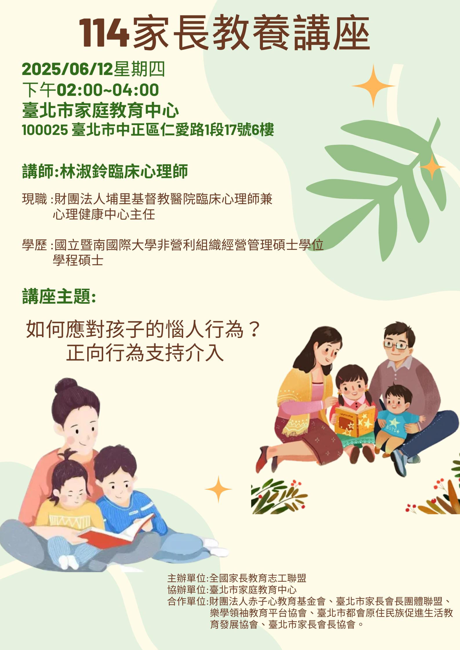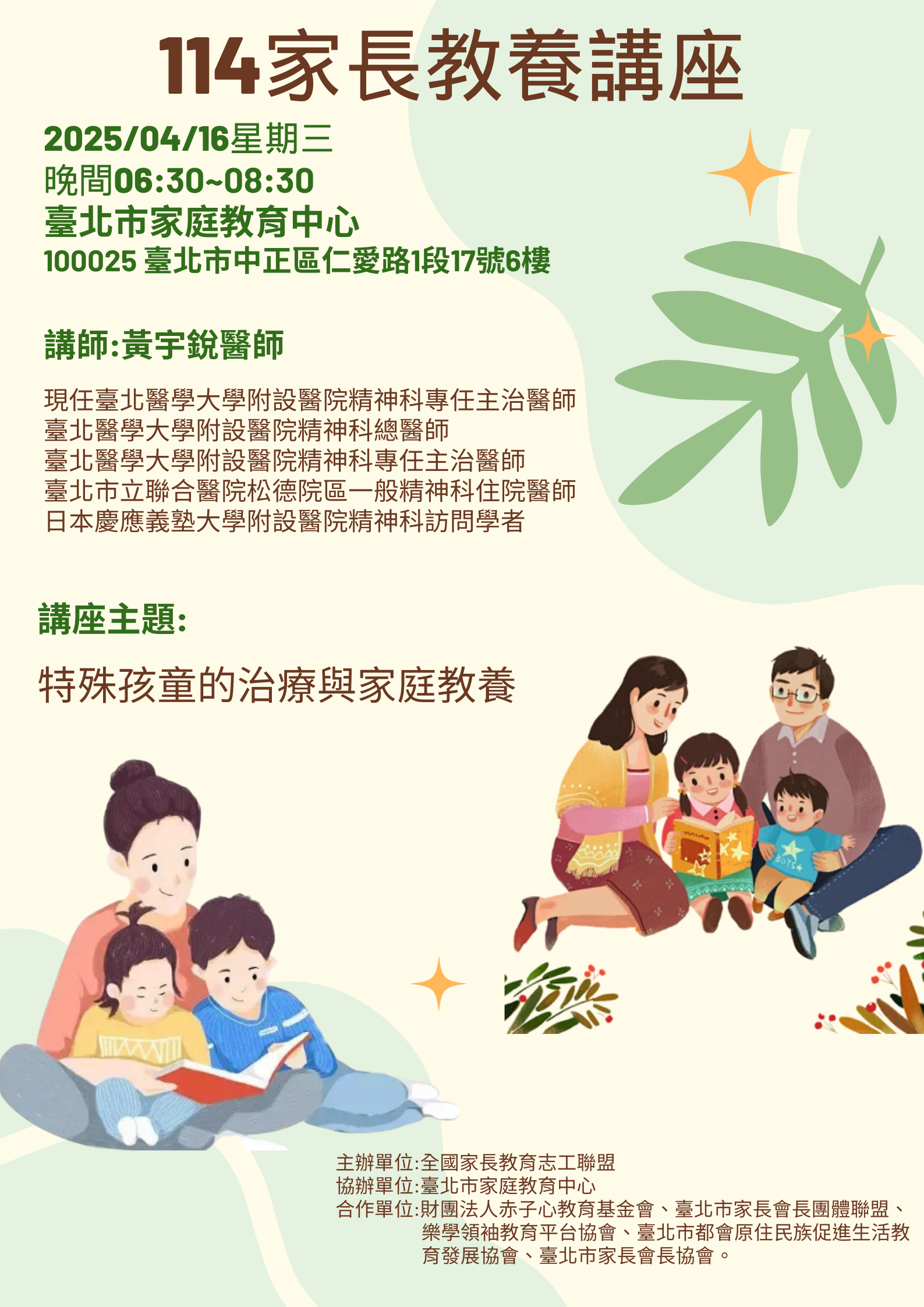 社團法人全國家長教育志工聯盟(下稱本聯盟)受教育部國民及學前教育署補助辦理114年度臺北市特殊教育孩童家長成長課程活動,部分課程尚有名額,有意參加的家長請詳見附件。