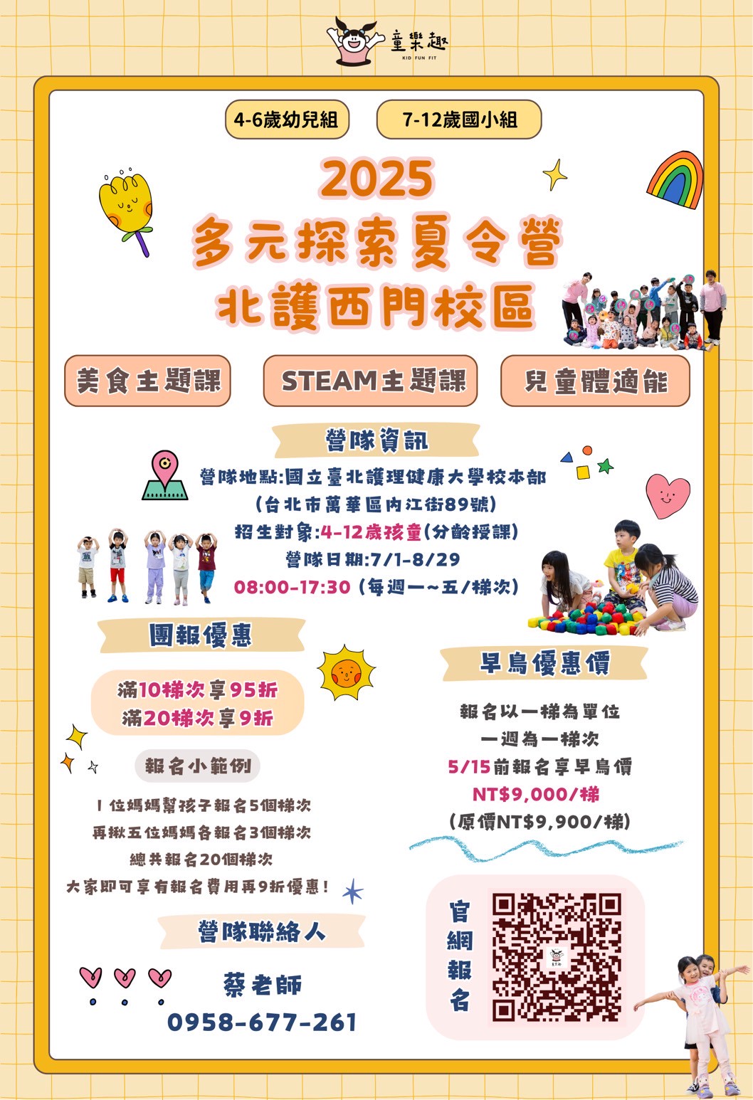 一、旨揭「2025西門校區-多元探索夏令營」謹訂於2025年07月01日至08月29日開課,即日起受理報名。