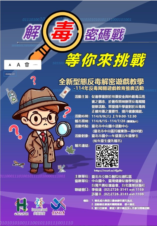 二、現今社會中,毒品問題逐漸低齡化發展,國小孩童也成為 毒品預防教育的重要對象。本市聯合醫院「解毒密碼戰」 活動透過闖關遊戲與兒童反毒繪本,以故事化、圖像化、 遊戲化的方式,增加孩童對於反毒教育的學習意願與動力。